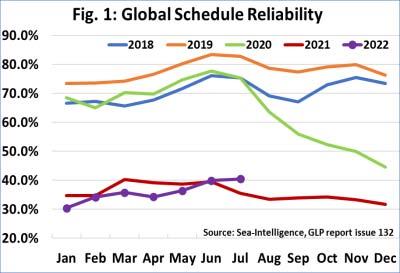 BALTIMORE: SeaIntelligence has publishedissue132ofthe Global Liner Performance (GLP) report, with schedule reliability figures up to and including July 2022. As the report itself is quite comprehensive and covers schedule reliability across 34 different trade lanes and 60+ carriers, this press release will only cover the global highlights from the fullreport.