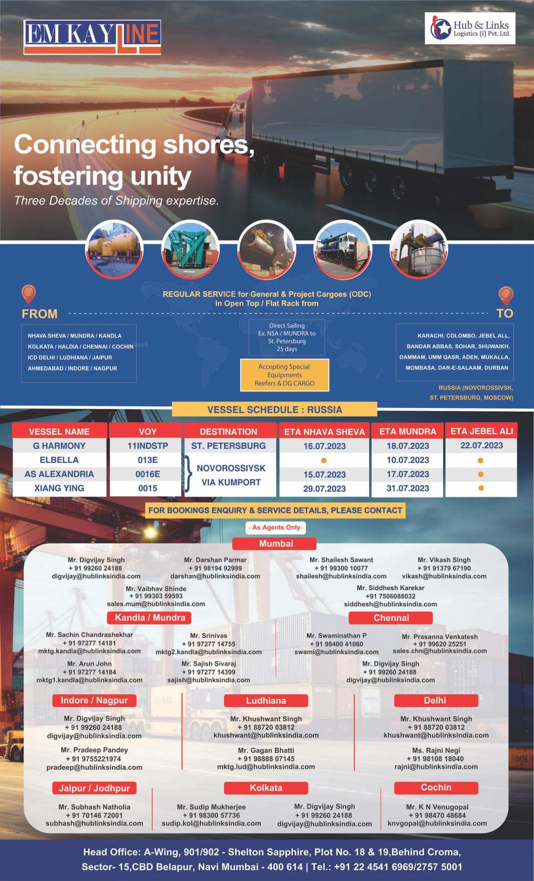 09/07 Northern Discovery (V-2326W) Hapag Llyod Hazira In Port Kiel Express (V-2326W) Hapag Llyod Nhava Sheva 18/07 Navious Jasmine (V-911E) Unifeeder Agency Nhava Sheva 10/07 Copiapo (V-3327W) Hapag Llyod Nhava Sheva In Port Seattle Bridge (V-0080) Cosco Shipping Karachi 12/07 Navious Bahamas (V-891E) Unifeeder Agency Karachi X-Press Anglesey (V-23004E) Colombo 08-07-2023 Divine Ace (V-85A) Pipavav 08-07-2023 Dalian Express (V-2325W) Jeddah 09-07-2023 X-Press Altair (V-23023) Jebel Ali 09-07-2023 VESSEL NAME NEXT PORT SAILING DATE 15/07 ESL Asante (V-02328S) Emirates Shipping Nhava Sheva 17/07 APL Florida (V-OIX49W) CMA CGM Ag. Jebel Ali 11/07 AS Christiana (V-OMTFBW) CMA CGM Ag. Nhava Sheva 14/07 APL Barcelona (V-OPE6XW) CMA CGM Ag. Nhava Sheva 10th JULY 2023 13 GUJARAT + NORTH INDIA