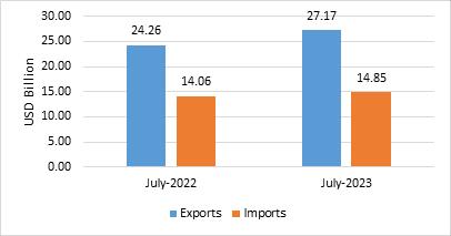 • Merchandise exports in July 2023 were USD 32.25 Billion, as compared to USD 38.34 Billion in July 2022.