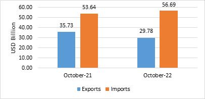 Non-petroleum and non-gems & jewellery exports in October 2022 were USD 21.72 Billion, compared to USD26.15BillioninOctober2021.