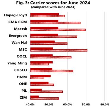Hapag-Lloyd was the most reliable top-13 carrier in June 2024 with schedule reliability of 55.4%. There were another 9 carriers above the 50% mark, with the remaining 3 carriers in the 40%-50% range. ZIM was the least reliable carrier with schedule reliability of 44.4%. Of the top-13 carriers, 7 recorded a M/M improvement in schedule reliability, with Yang Ming recording the highest improvement of 6.1 percentage points. ZIM recorded the largest M/M decline of -3 3 percentage points On a Y/Y level, only HMM and Yang Ming recorded an increase in schedule reliability, while MSC recorded the largest Y/Y decline of -18 5 percentage points
