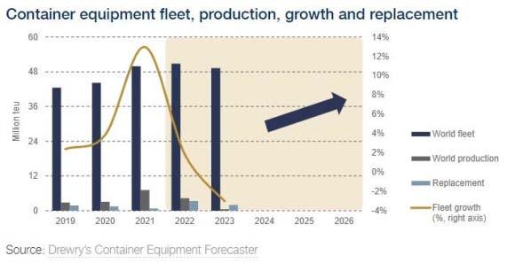 Drewry forecasts that production will fall ‘drastically’ in 2023as‘fewownersareexpectedtoexpandtheirfleetsandnot everycontainerbeingretiredwillbereplacedwithanewone.’