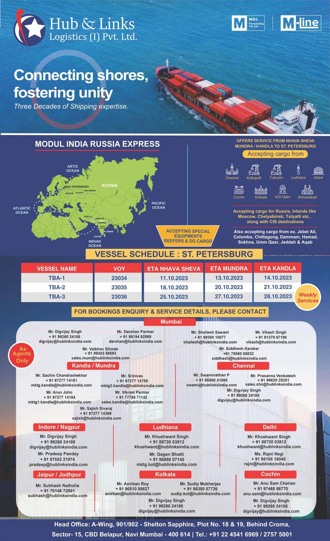 Sounio Trader (V-2338W) 04-10-2023 Jebel Ali Jairan (V-1310W) (NSDT) 04-10-2023 Bandar Abbas Ornella (V-OUW16W1) 05-10-2023 Mundra Hansa Europe (V-2340) 05-10-2023 ACMTPL Mombasa Express (V-001W) 05-10-2023 Norfolk Addison (V-2339W) 06-10-2023 Colombo Tiger Ocean (V-E23015) 05-10-2023 MICT Maersk Utah (V-340W) 05-10-2023 Fujairah ESL Kabir (V-2336E) 05-10-2023 Port Kelang CMA CGM Quaelimane (V-OMTFZW1) 06-10-2023 Durban MSC Elaine (V-IP340A) 07-10-2023 Hazira Irenes Rule (V-2306W) 07-10-2023 Mundra Maersk Boston(V-340S) 08-10-2023 Port Qasim Maersk Kinloss (V-339W) 09-10-2023 Salalah MSC Tokyo (V-IU339A) 05-10-2023 Mundra SSL Mumbai (V-0008) 05-10-2023 Jebel Ali MSC Irene (V-IS340A) 06-10-2023 AICT MSC Beijing (V-IE339A) 07-10-2023 Hazira Nildutch Lion (V-3340W) 08-10-2023 ACMTPL Seaspan Gangas (V-3140) 09-10-2023 ACMTPL X-Press Bardsey (V-23008E) 02-10-2023 Colombo CUL Yangpu (V-2338W) 03-10-2023 Jebel Ali OOCL Hamburg (V-145E) 03-10-2023 Pipavav Wan Hai 502 (V-E116) 05-10-2023 Port Kelang Yantian Express (V-2339W) 05-10-2023 AICT Seaspan Adonis (V-072E) 07-10-2023 Pipavav Wan Hai 311 (V-E226) 08-10-2023