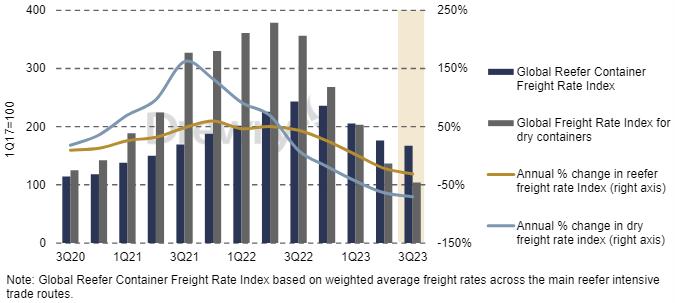 Reefer container freight rates have been declining since their peak of 3Q22 but at a more measured pace than for dry freight. This is because reefer’s peak was less pronounced due to the greater prevalence of annual contracts, while the stronger resilience of the less overtonnaged North-South trade routes, on which the