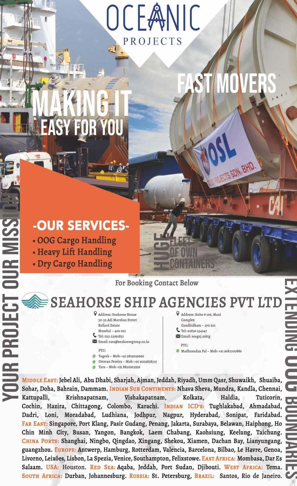 COSCO COSCO Shpg. U.K., North Cont., Scandinavian, Red Sea & Med. Ports. Indial Indial Shpg. U.K., North Cont., Scandinavian, Red Sea & Med. Ports. Seahorse Ship U.K., North Continent, Scandinavian Ports & Riga, Klaipede, Tallim, St.Petersburg, Genoa, Valencia, Fos Globelink Globelink WW U.K., North Continent, Scandinavian Ports & Ashdod, Piraeus, Thessaloniki, Athens, Unifeeder Unifeeder Ag. U.K., North Continent & Scandinavian Ports. Dron.2 & TLP
