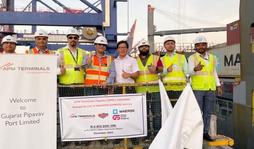 PIPAVAV: APM Terminals Pipavav welcomed the first call of “Shaheen Express” at the port in early December. The weekly service, operated by Maersk will rotate among the ports of Jebel Ali – Dammam – Jebel Ali – Mundra –Pipavav – Jebel Ali. The service will provide the transit time of 2 days to Jebel Ali and 4 days to Dammam there by offeringoneofthefastesttransittimestotheGulfmarkets.