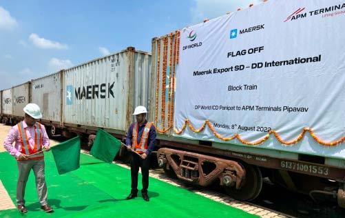 Pipavav, one of the leading gateway ports in Western India received the first full block train for D.D. International Private Limited. The train was flaggedofffromICDPanipatinthefirstweekAugustand reached the port within 2 days. The block train is operated by the DP world for Maersk to transport the cargoforD.D.InternationalPrivateLimited.