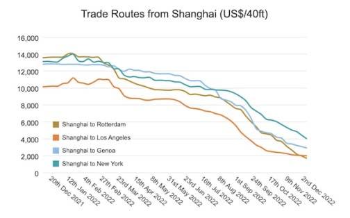 The composite index decreased by 1% to $2,127.33 per 40ft container, and is 77% lower than the same week in 2021. Freight rates on New York – Rotterdam dropped 4% or $53 to $1,269 per feu. Spot rates on Shanghai – New York and Shanghai – Rotterdam fell 1% each to $3,952 and $1,674 per 40ft box, respectively. Similarly, rates on Los Angeles – Shanghai and Rotterdam – New York slipped 1% each to $1,175 and $7,050 per 40ft container, individually. Rates on Rotterdam – Shanghai, Shanghai – Genoa and Shanghai – Los Angeles hovered around the previous week’s level. Drewry expects smaller week-on-week reductionsinratesinthenextfewweeks.
