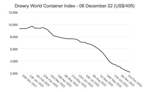 The latest Drewry WCI composite index of $2,127 per 40-foot container is now 79% below the peak of $10,377 reached in September 2021. It is 21% lower than the 10-year average of $2,692, indicating a return to more normal prices, but remains 51% higher than average2019(pre-pandemic)ratesof$1,420.