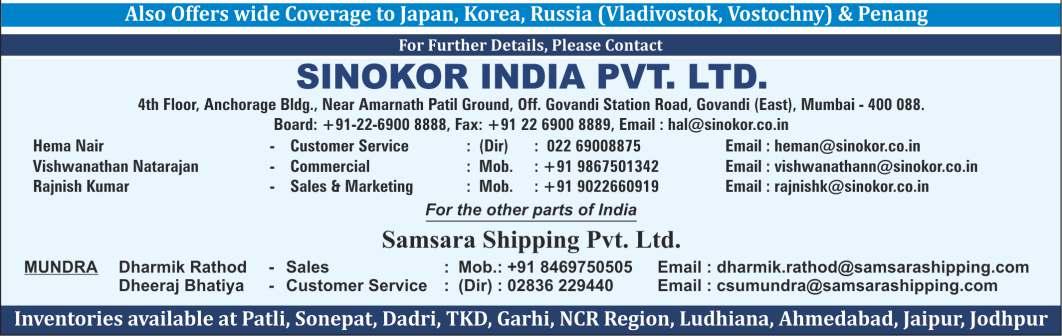 23/1125/11 TBA TBA Henrika 2243E N1504 258586-08/11 KMTC KMTC (India) Port Kelang(W), Hongkong, Qingdao, Kwangyang, Dronagiri-3 27/1129/11 TBA TBA TS Dubai 22007E N1515 258678-09/11 TS Lines TS Lines (I) Pusan, Ningbo, Shekou, Singapore. Dronagiri-2 02/1204/12 TBA TBA ESL Kabir 2245E COSCO COSCO Shpg. (AIS SERVICE) 07/1209/12 TBA TBA KMTC Mundra 2207E Emirates Emirates Shpg. Port Kelang, Hongkong, Qingdao, Kwangyang, Pusan,Ningbo, Shekou, Singapore. Dronagiri-2 CU Lines Seahorse Ship Port Kelang,Hongkong,Busan, Qingdao,Ningbo.