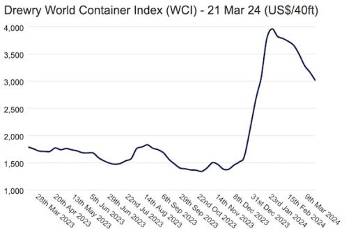 The latest Drewry WCI composite index of $3,010 per 40ft container is 112% more than average 2019 (pre-pandemic) rates of $1,420.