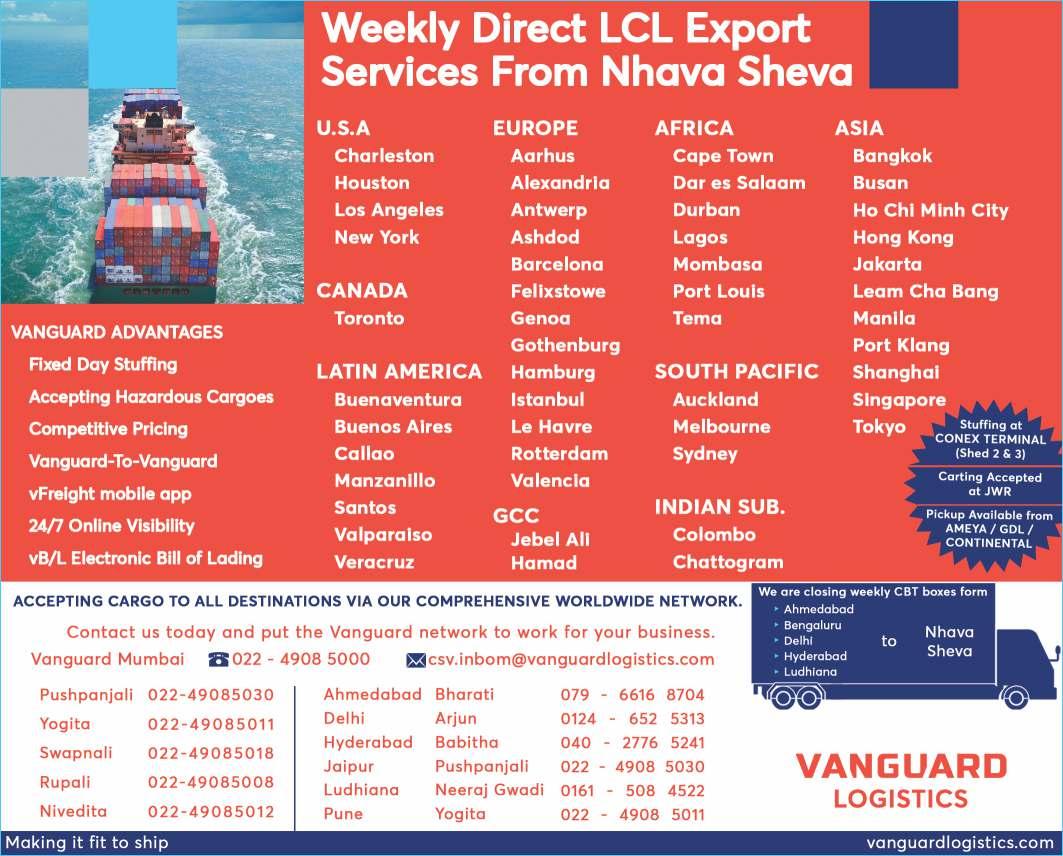 Haian East (V-23003W) 26-02-2023 Jebel Ali GFS Giselle (V-2301E) 23-02-2023 MICT Maersk Incheon(V-308W) 23-02-2023 Fujerah Vira Bhum (V-2305E) 23-02-2023 Port Kelang Inter Sydney (V-0130) 24-02-2023 Colombo CMA CGM Valpariso (V-OMTE5W1) 24-02-2023 Durban Gulf Barakah (V-2303W) 24-02-2023 Sohar MSC Joanna (V-IP308A) 25-02-2023 Hazira Maersk Boston (V-308S) 26-02-2023 Port Qasim Maersk Kensington (V-307W) 27-02-2023 Salallah MSC Lisbon (V-IP307A) 19-02-2023 Hazira MSC Jewel (V-FK303A) 20-02-2023 Jebel Ali ONE Altair (V-3106) 20-02-2023 ACMT Niledutch Lion (V-3307W) 22-02-2023 ACMTPL