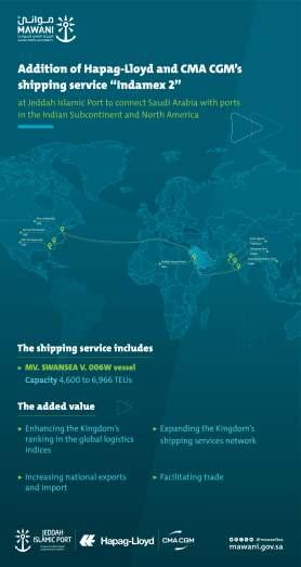 RIYADH : The Saudi Ports Authority (Mawani) has announced the addition of the Indamex 2(IN2) shipping service, a routejointly operated by global container liners Hapag-Lloyd and CMA CGM to Jeddah IslamicPort.
