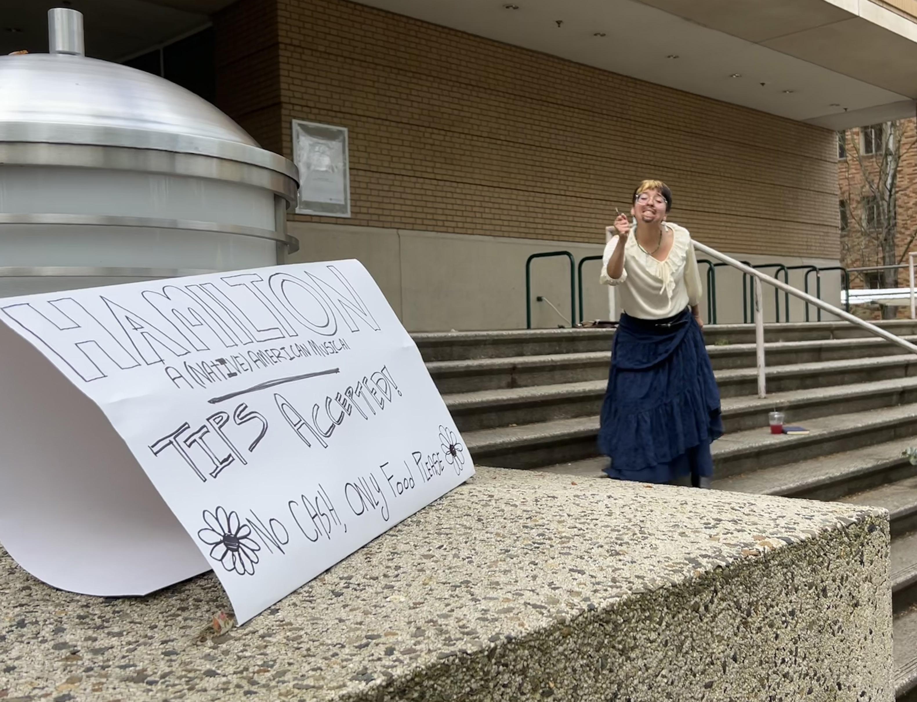 In the middle of the rush at the Portland State Farmers Market, Cassie Funmaker stood on the steps of the Millar Library, turned on their speaker and began singing and dancing along to the opening song of “Hamilton.”