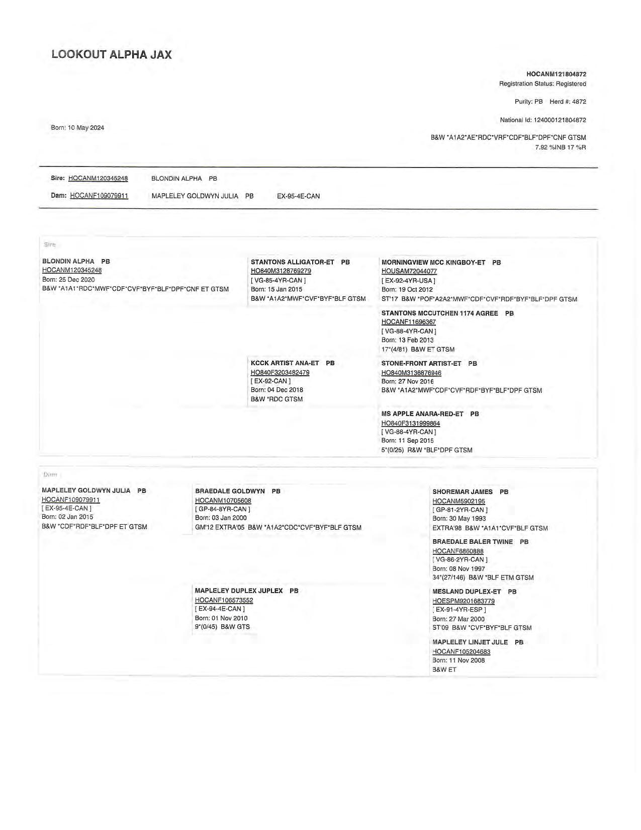 99%RegisteredHolsteinAncestry(RHA-I) A1/A2AA32K GTPI81%R GARAY-MD-WVGBLAIR-RED-ET G +1960 84000324451508599%RHA-ITCTLTD