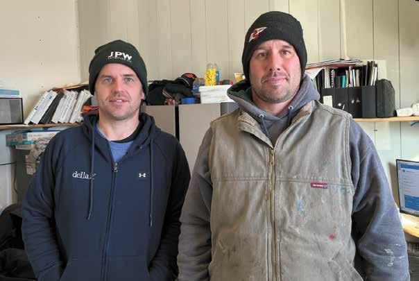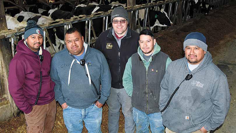 MARK KLAPHAKE/DAIRY STAR The Felling Dairy breeding team – Victor Ledsma (from le ), Hilarion Torres, Jason Felling, Saul Hernandez and Marcos Gomez – stand in the freestall barn Nov. 28 at Felling Dairy near Sauk Centre, Minnesota. Felling Dairy received the pla num 2022 Excellence in Dairy Ca le Reproduc on Award.www.dairystar.com