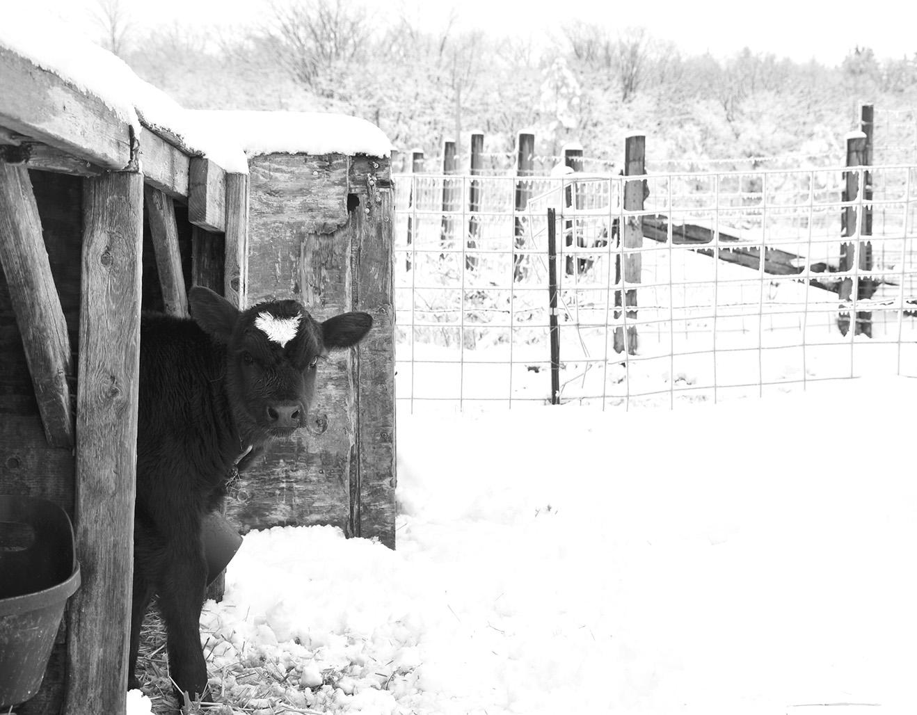 MARK KLAPHAKE/DAIRY STAR (Le ) A calf peeks out of its hut Dec. 14 to look at the fresh snow that fell through the night on the Roering family dairy near Sauk Centre, Minnesota. Paul Roering and his sons, Isaac and Jake, milk 107 cows.