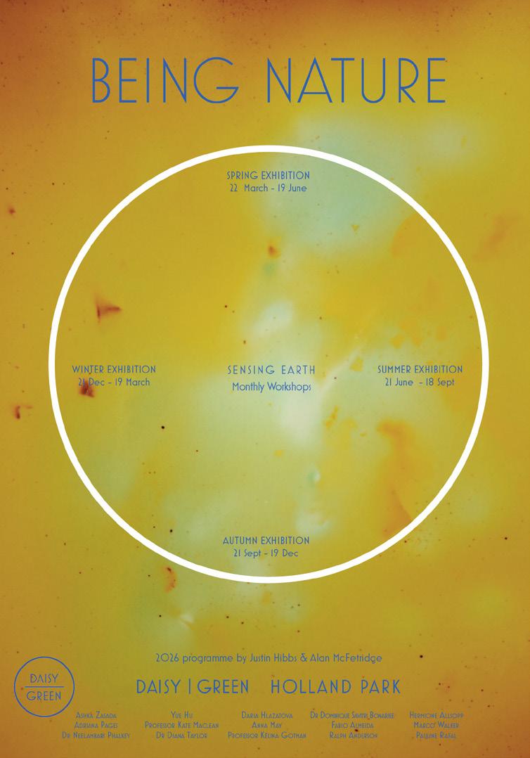 Being Nature returns to Holland Park Café for its second year, a rolling arts residency and exhibition programme curated by Justin Hibbs and Alan McFetridge in collaboration with Daisy Green. Across four exhibitions throughout the year, works sit within the everyday life of the space, encountered between coffees, conversations and walks through the park.