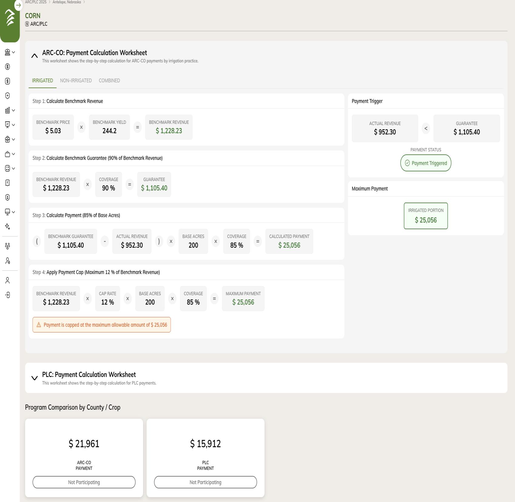 Thischartshowsacoveragebandbetween$689 and$823 peracre,where overlappingSCO,ECO,andARC-COprograms increase protectionfrom$130toapotentialof$318peracre.Note:Actualresultsdependonhowthe farm’s APHcomparestothe county‘s average yield(inthisexample:APH= 215,Countyyield= 185,ARCbenchmarkyield=183).