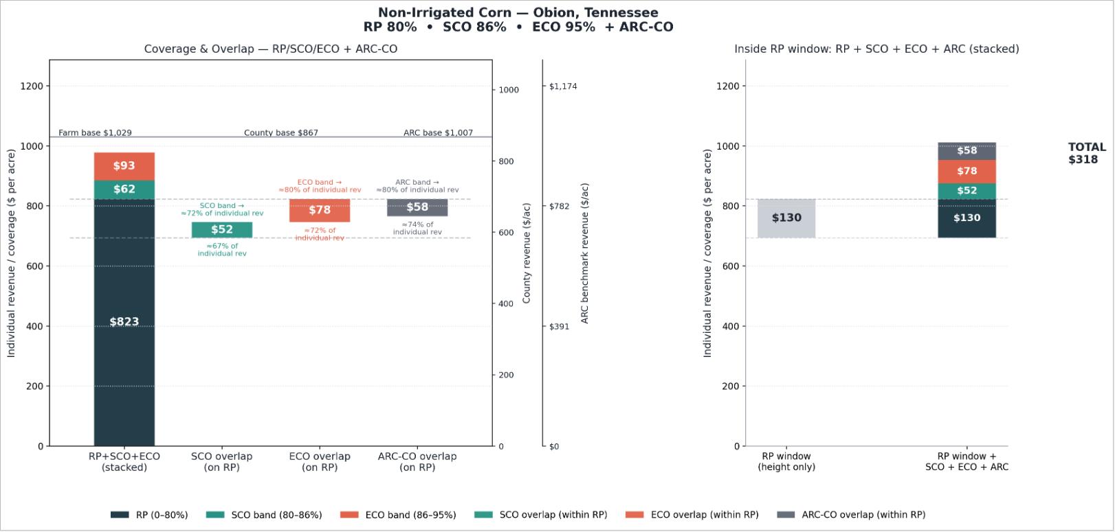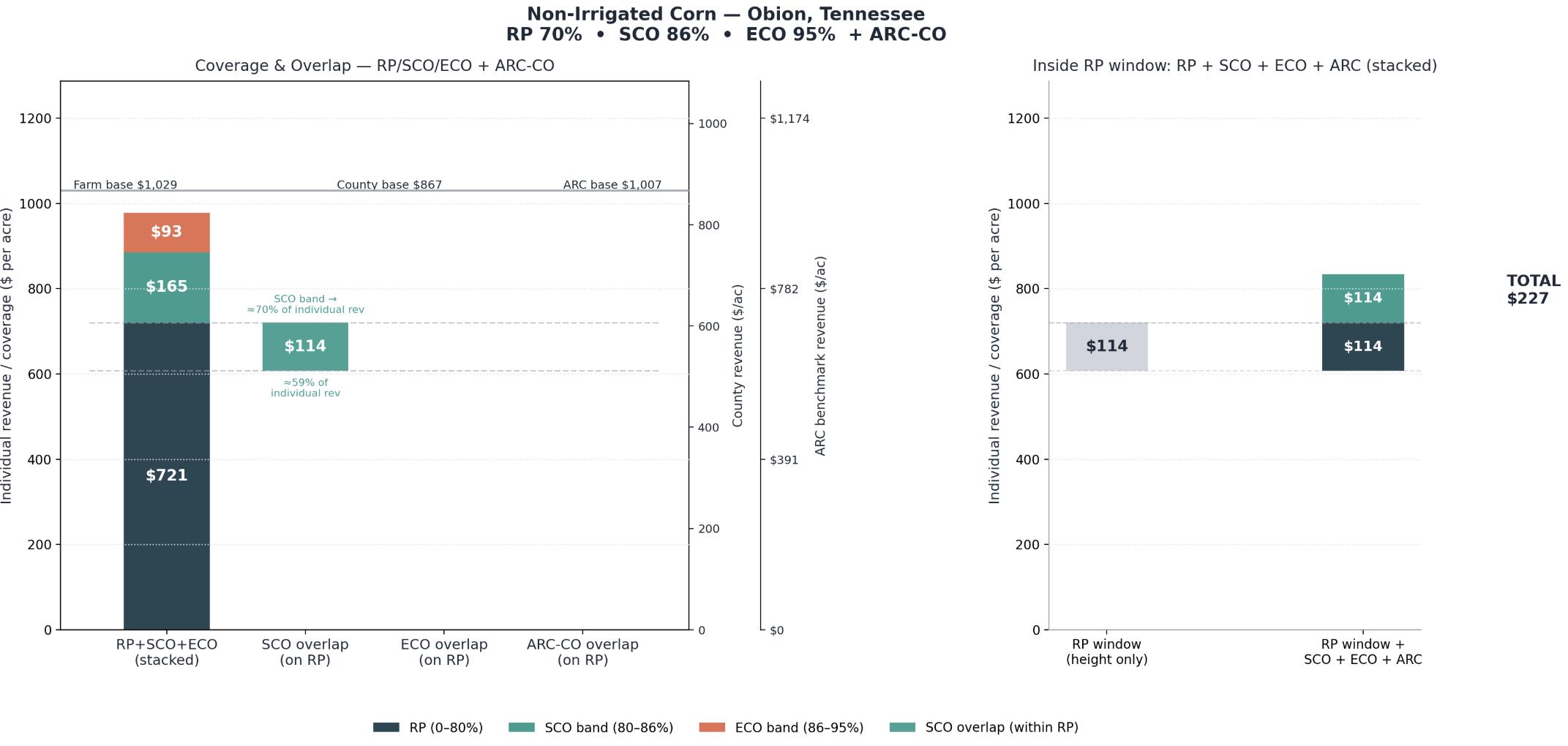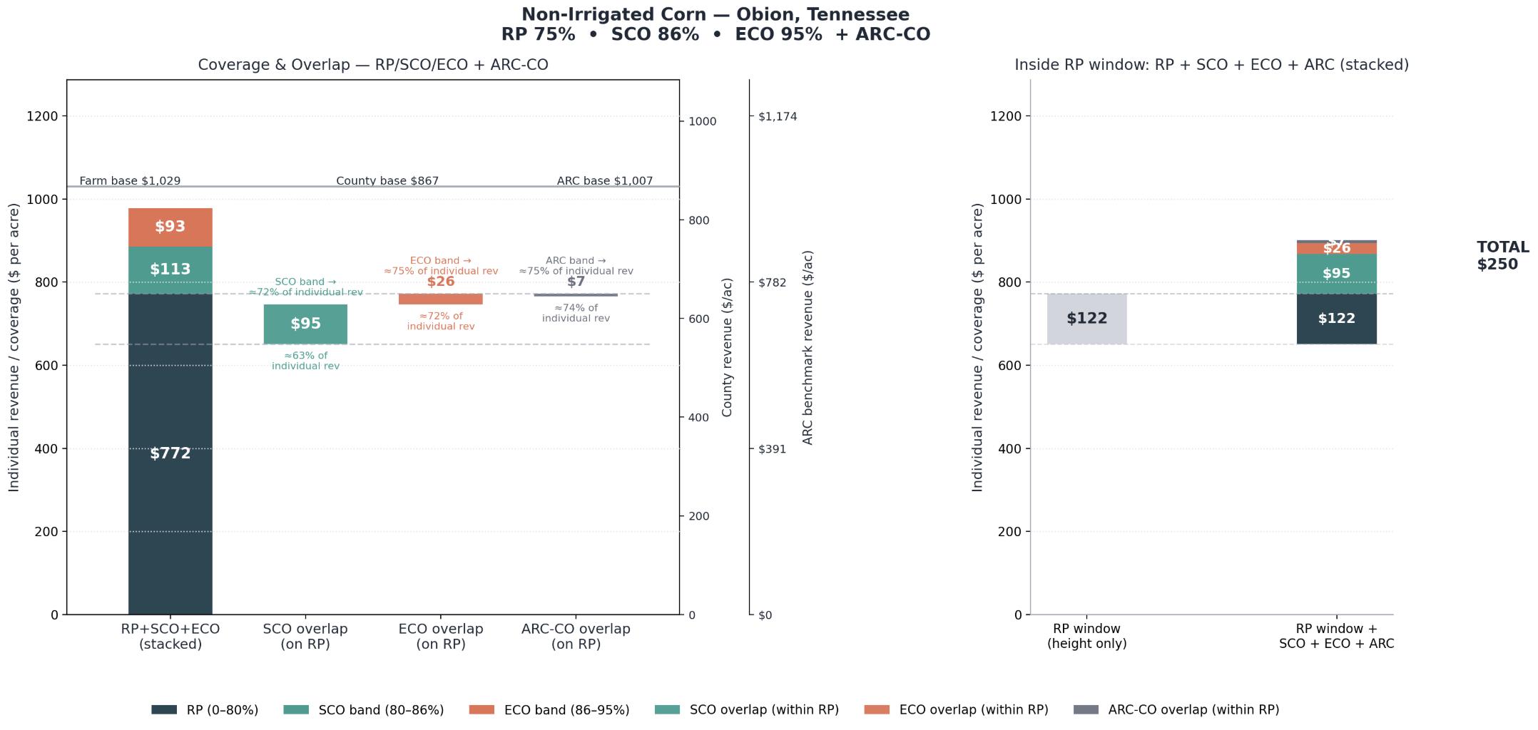 Thischartshowsacoveragebandbetween$648 and$772 peracre,where overlappingSCO,ECO,andARC-COprograms increase protectionfrom$122underRP75%to$250 peracre.Note:theexactgaindependsonhowthe farm’sAPHcomparestothe county's average yield(inthisexample,APH= 215,Countyyield= 185,andARCbenchmark yield= 183).