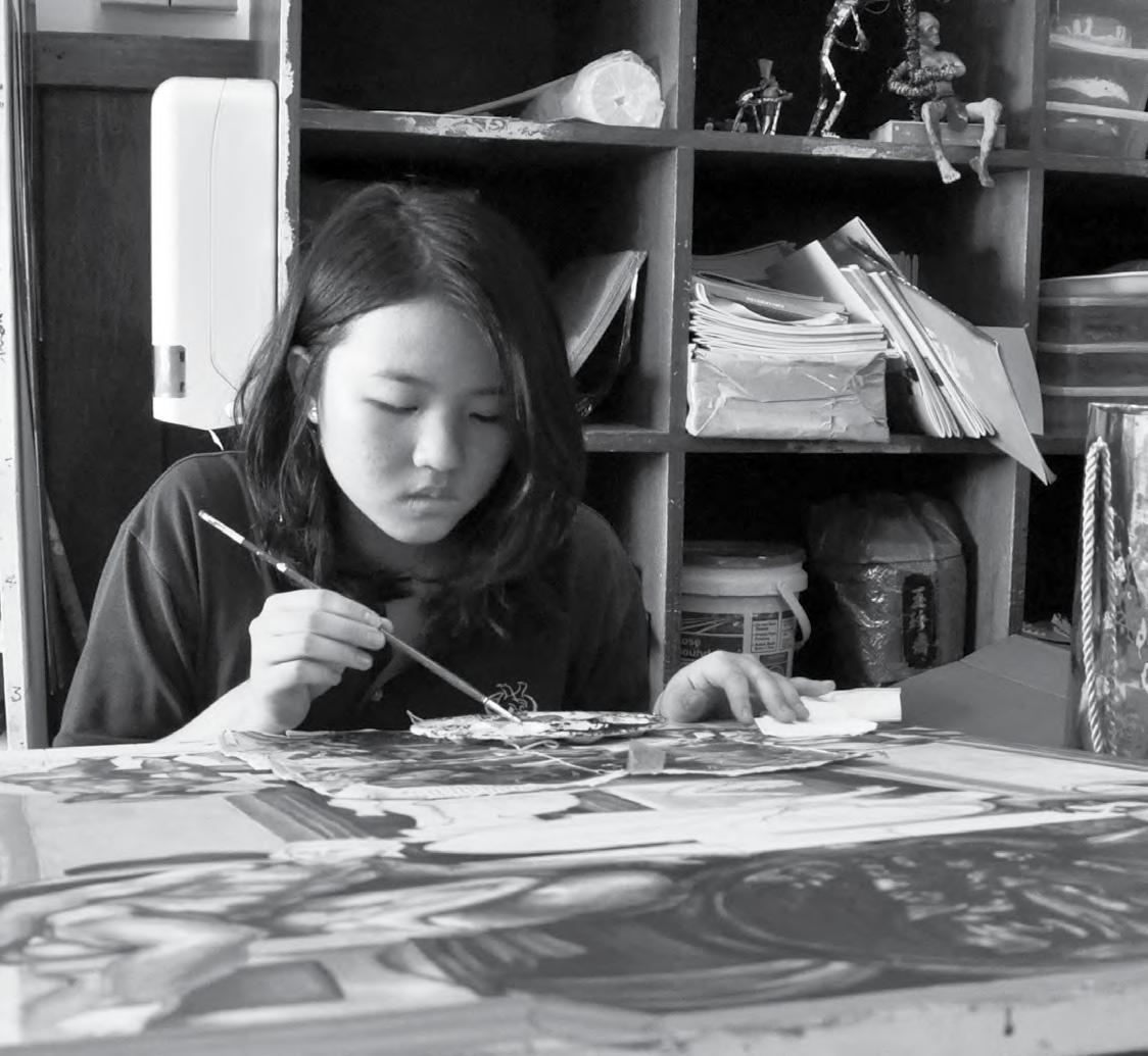 Twirling her body to and fro across the floor, Andriani Sugianto (10) performed her artistic dance in front of a crowd of awestruck people. Drawing across a sheet of cloth with charcoal in their hands, Joyce Lee (12) and Sugianto danced to the rhythm of music while creating a work of art. Critics and fans alike flocked to Straits Quay on 21 May to experience the Fine Arts Festival.