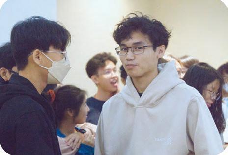 Usingtheirfreetime wisely,NoahLee(12)and RyanChew(12)discuss whattheyhavebeen learningattheretreat andwhattodolaterin theirfreetime.Whether theywantedtobethere ornot,seniorsatleast gottheopportunityto spendalittlemoretime witheachotherbefore leavingtheschool.