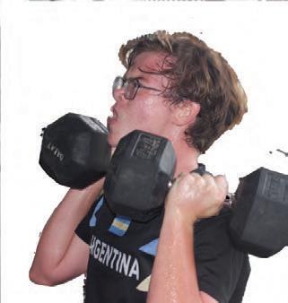 Huffingandpuffing,Isaac Beaman(11)raisesapairof17.5 kgdumbbellsoverhisshoulder. Manypeopleparticipatedin theCrossFitclubafterschool, asitwasagoodwaytokeepfit andbondwithfriendsover intensephysicalactivities.