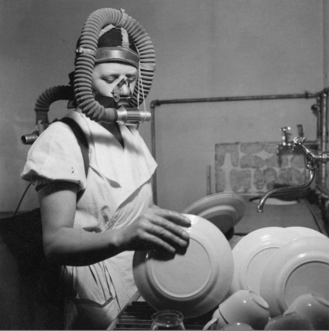 Kvinna i andningsmask diskar i kök. Hemmens forskningsinstitut. Foto: Atelje Hernried. Nordiska museet.