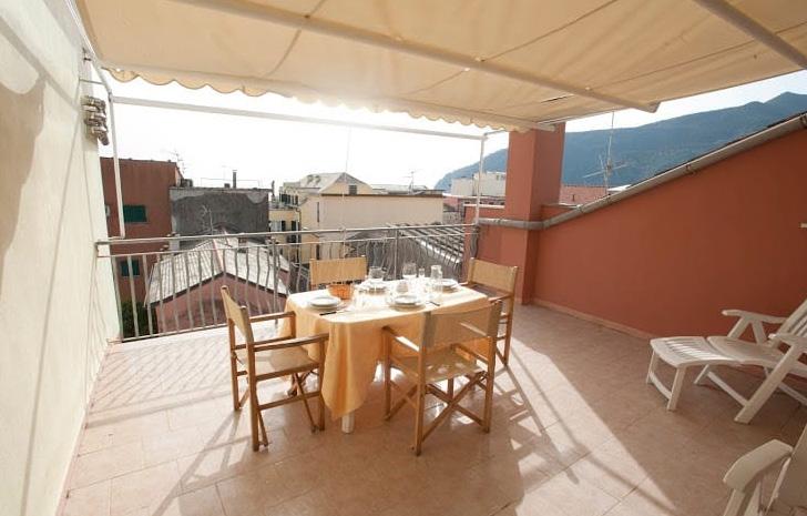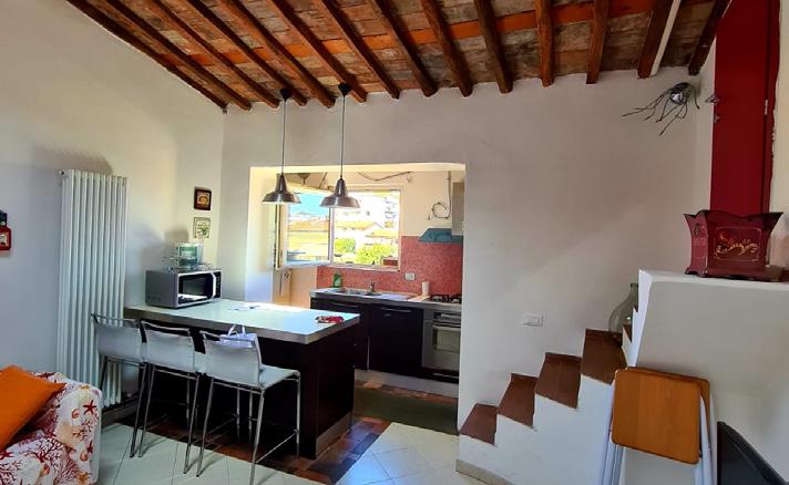 Attico ristrutturato finemente con terrazza mq. 200 con vista a 360° mare e monti. Soggiorno con cucina a vista in muratura, camera matrimoniale con bagno di servizio, cameretta, bagno con doccia. Pompe di calore. Terrazza con veranda e doccia esterna.
