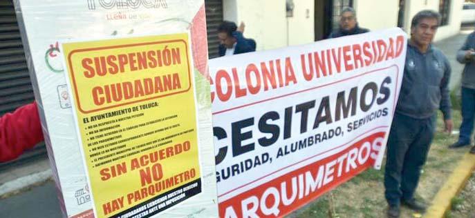 Vecinos de la colonia Universidad de Toluca llevaron a cabo una suspensión ciudadana en los 64 cajones contempladoscomo parquímetros en esa zona de la capital mexiquense para exigir al ayuntamiento su reubicación a otras áreas del municipio.