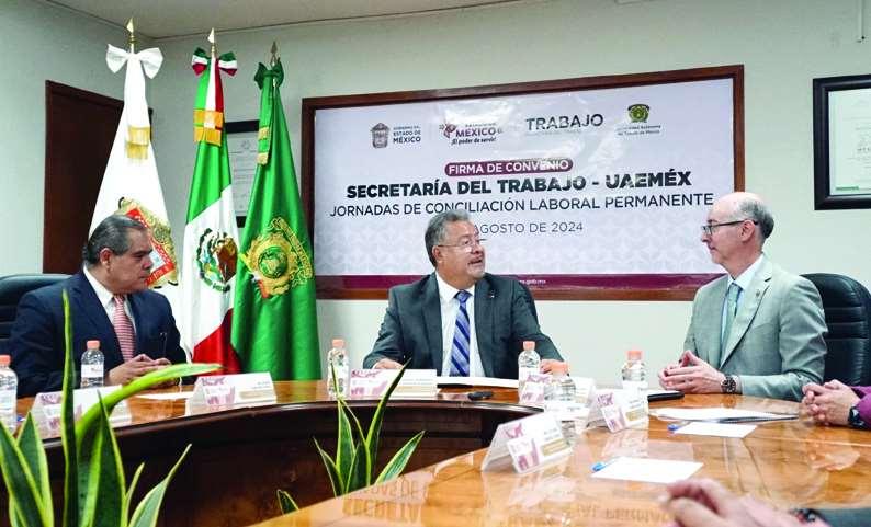 resbasadaenlajusticiayenlaresolución de conflictos de manera eficaz, la Universidad Autónoma del Estado de México (UAEMéx) y la Secretaría del Trabajo del Gobierno del Estado de México signaron un convenio para desarrollar Jornadas de ConciliaciónLaboralPermanente.