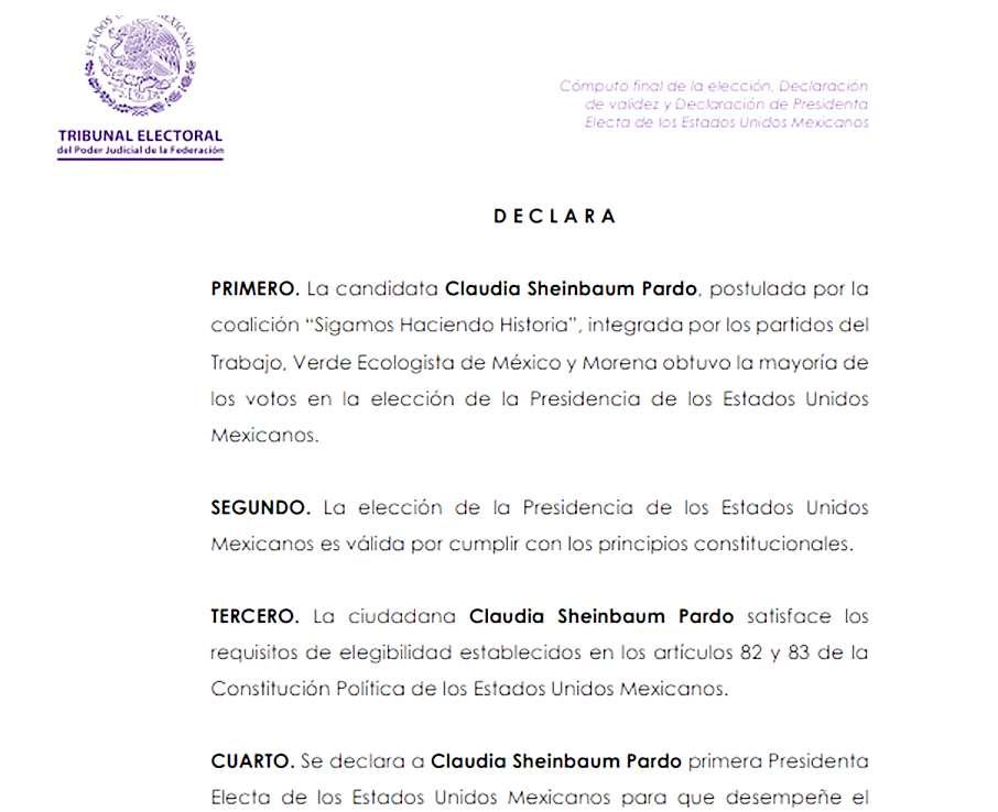 En un día histórico para la vida políticaydemocráticadelpaís, losmagistrados del Tribunal Electoral del Poder Judicial de la Federación declararon formalmente a Claudia Sheinbaum Pardo comolapróximatitulardelPoderEjecutivo Federal al obtener el 59.71 por ciento de la votación en las pasadas elecciones de junio, lo que significa que 35 millones 924 mil 519 mexicanos sufragaron a su favor. La cifra de votos en favor de quien a partir del uno de octubre próximo será la primera presidenta del país también puede considerarse como histórica. Los integrantes del órgano colegiado -Janine Otalara, Mónica Soto, Claudia Valle, Felipe de la Mata y Felipe Fuentes barrera--- declararon a Sheinbaum como la primera presidente de México, quien habrá de celebrar el hecho, una vez recibida la constancia de mayoría, en el TetroMetropolitan, alqueseespera el arribo desenadores,diputados,gobernadores,funcionarios de los tres niveles de gobierno y dirigente del Movimiento de Regeneración Nacional, el que llevó al poder a la también exjefa de gobierno de la capital del país. La vigilanciaenelreferido Tribunalsehaintensificado tras el anuncio hecho por organizaciones opositoras no solo a Sheinbaum Pardo, sino también al presidente López Obrador y miembros del citado Tribunal e Instituto Nacional Electoral, a los que acusan de truquear los resultados de las pasadas elecciones, lo que fue destacado en el noticiario estelar de unomásuno,CambiandodeTemaNoticias,por sus conductores, Susi Bazán y Raúl Ruiz Venegas, quienes,dirigidos por nuestro presidente editor, Naim Libien Kaui, ratificaron quelagestiónde SheinbaumPardocomopresidenta de todos los mexicanos, no solo los que votaron por ella, habrá de concluir el día