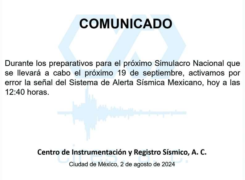 "Durante los preparativos para el próximo Simulacro Nacional que se llevará a cabo el próximo 19 de septiembre, activamos por error la señal del Sistema de Alerta Sísmica Mexicano, hoy a las 12:40 horas", escribió en sus redes sociales.