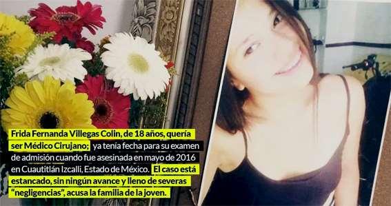 El asesinato de Frida Fernanda Villegas Colin, de 18 años de edad, victimizada en mayo de 2016 en elterritoriomexiquensede CuautitlánIzcalli,hoyen2024 sigue impune y estacando. La familia de la víctima ha puesto sobre lamesaunaserie depresuntas omisiones eirregularidades-sindejardeladoeltráficode influencias- por parte la Fiscalía General de Justicia del Estado de México a lo largo de ocho añosde impunidad.