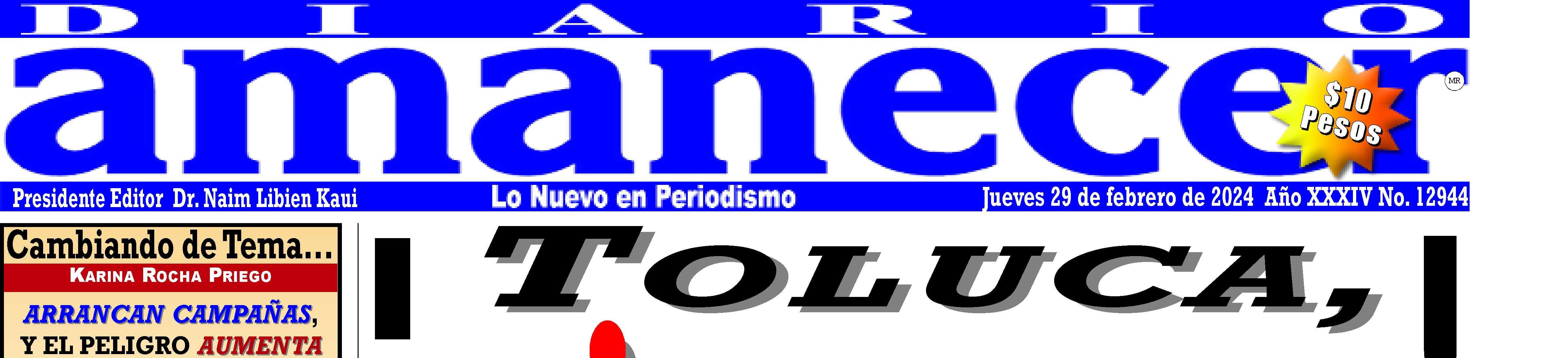DIARIOAMANECERDEMÉXICO,DIARIOAMANECERDELESTADODEMÉXICO,ELDEMÓCRATADEMÉXICO,DIARIOATARDECERDEMÉXICO,DIARIOATARDECERDELESTADODEMÉXICO,circulacióndiaria,oficinasubicadas enPaseoTollocanNo.613Ote.,enToluca,Edo.deMéxico,Tels:(01-722)134-00-00,con14líneasAGENCIASINFORMATIVAS:EXC-ANE,ASIC,PRESSLINKONLINE,AME,MVT,unomásunoOficinasenMéxico,D.F.,GabinoBarredaNo.86 ColoniaSanRafael,Tels.:55-10555500con14líneas.AUTORIZACIONES:Reg.Gráfico:038/0390,CertificadodeLicituddeContenidoyCertificadodeLicituddeTítulo:15581ReservaDerechosdeAutorNo.