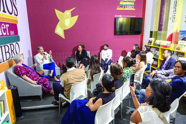 Acompañada de Alicia Elena Pérez Duarte y Noroña y Elisa Ortega Velázquez, expertas del