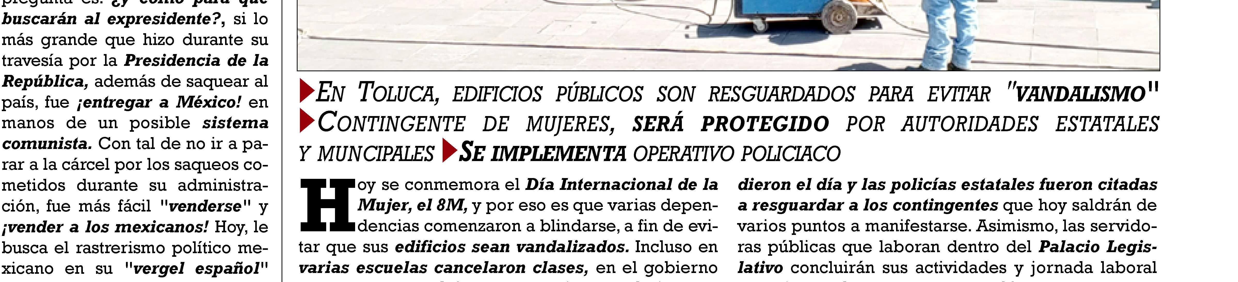 Hoy se conmemora el Día Internacio-nal de la Mujer, el 8M, y por eso es que varias dependencias comenzaron a blindarse, a fin de evitar que sus edificios sean vandalizados. Incluso en varias escuelas cancelaron clases, en el gobierno del Estado de México, a las servidoras públicas les dieron el día y las policías estatales fueron citadas a resguardar a los contingentes que hoy saldrán devariospuntosamanifestarse.