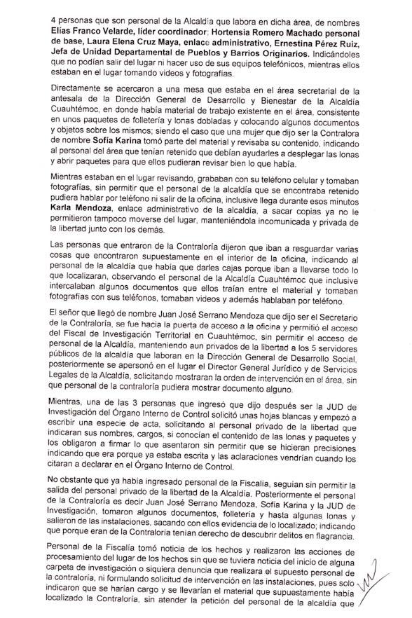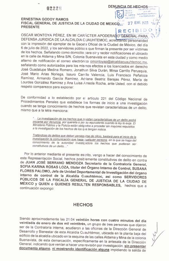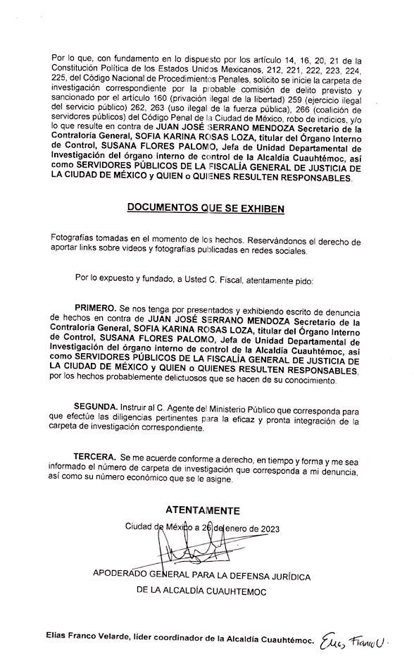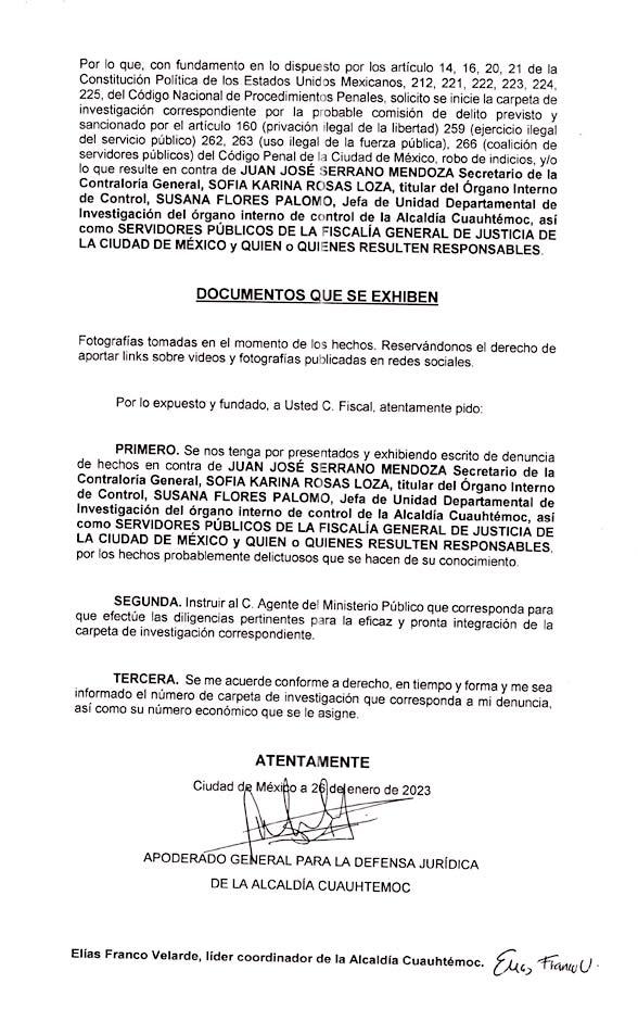 Por la tarde,el apoderado general de la alcaldía Cuauhtémoc, Óscar Montoya Pérez,presentó una denuncia de hechos ante la Fiscalía General de Justicia de la Ciudad de México por lo ocurrido al interior de la citada alcaldía.