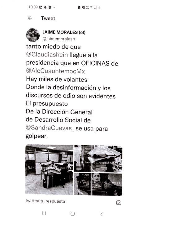 ROBERTO MELENDEZ S.Una presunta denuncia ciudadana,en la cual se informaba de la existencia de miles de panfletos y mantas de "propaganda negra" contra la jefa de Gobierno de la Ciudad de México en instalaciones de la alcaldía Cuauhtémoc, agudizó la confrontación que desde hace meses sostienen Claudia Sheinbaum y la alcaldesa Sandra Cuevas, cuyo final es considerado por analistas como "reservado", aunque dan "ligera ventaja” a la primera por el apoyo que recibe tanto del presidente Andrés Manuel López Obrador como de la fiscal general de Justicia, Ernestina Godoy Ramos, mientas que la segunda tiene el respaldo de los alcaldes de oposición y la comunidad de la demarcación,una de las más importantes y aguerridas de la Metrópoli,la que a decir de los volantes se ha convertido en una tragedia,en la que mensualmente son asesinadas 10 mujeres y en la que el Sistema de transporte Colectivo Metro,de diciembre de 2018 a la fecha,ha sufrido mil 800 accidentes,algunos de ellos con resultados trágicos y la muerte de decenas de viajeros.