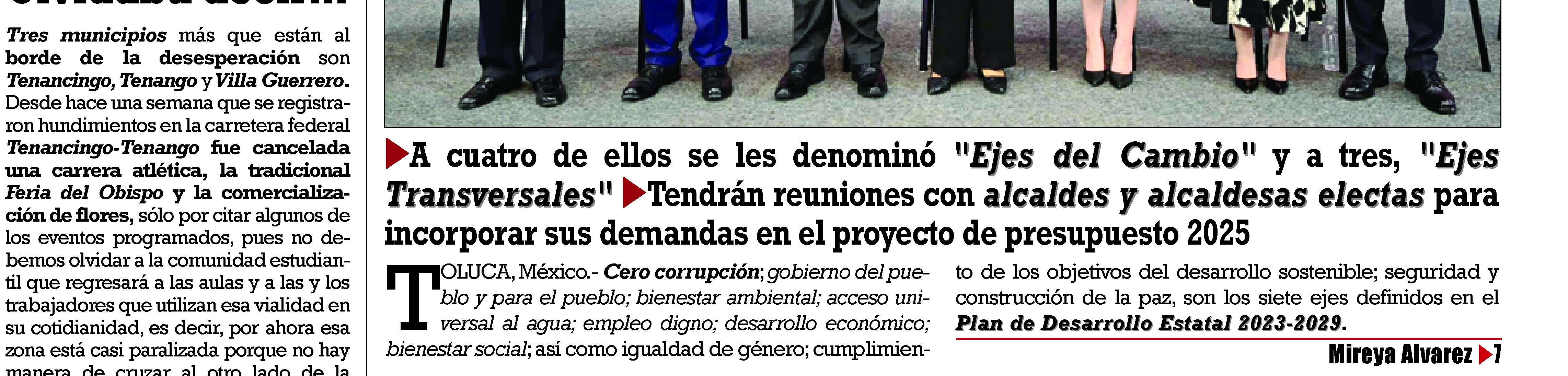 Toluca,México.- Cero corrupción;gobierno del pueblo y para el pueblo; bienestar ambiental; acceso universal al agua; empleo digno; desarrollo económico; bienestar social; así como igualdad de género; cumplimiento de los objetivos del desarrollo sostenible; seguridad y construcción de la paz, son los siete ejes definidos en el Plan de Desarrollo estatal2023-2029.