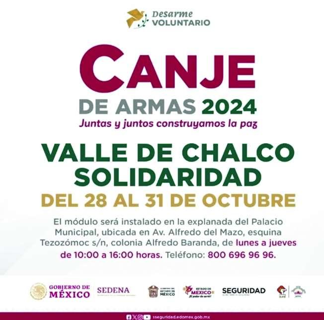 Elgobiernomunicipalquesumaesfuerzosconlasautoridadesfederalesyestatales,continúanbuscandolaseguridad ciudadanayreforzandoelbienestardelasfamilias,porlo queenestaaccióndelostresórdenesdegobiernosecontinuaimplementadoelprogramaderecolecciónycanjede armasdefuego,quelaciudadaníaentregaacambiode objetosorecursosquerecibenporentregarartefactos,que sondemuchoriesgoymalainfluenciaparapequeñose integrantesdelasfamiliasvallechalquenses.