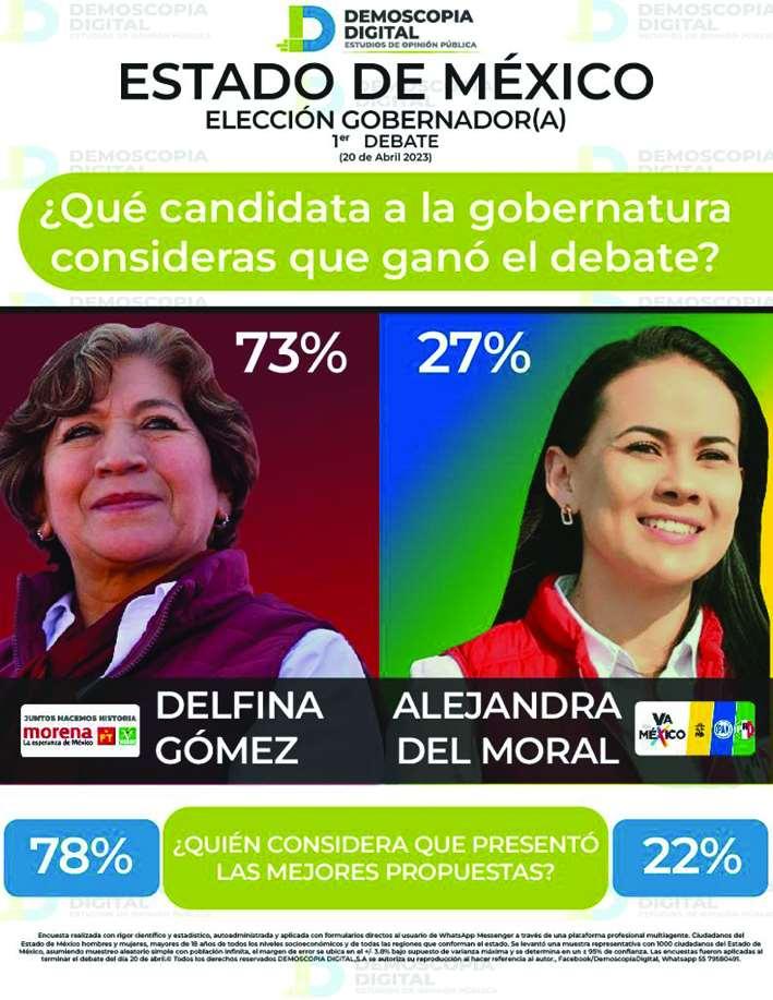 En la encuesta de Demoscopia, la maestra Delfina Gómez obtuvo el 78% de reconocimiento en la "Quién considera que presentó las mejores propuestas", una ventaja de 56 puntos sobre Del Moral,a