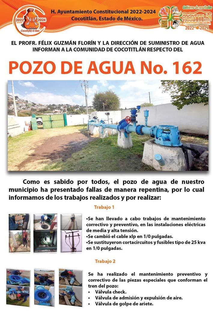Tras hacer un estudio con cámara de videograbación que se introdujo a una profundidad de 190 metros se detectaron fallas en el pozo, porque en los últimos años no se le hizo mantenimiento adecuado y por lo que el pozo está en riesgo y se tiene que hacer un trabajo a profundidad antes de que pueda colapsar la extracción del vital líquido del este pozo 162.