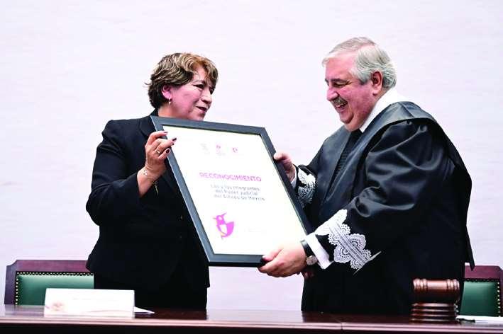 En este tenor dijo que la entrega de estos distintivos en el marco del 199 aniversario del Poder Judicial mexiquense es un reconocimiento que honra a quienes se han destacado por su labor en la promoción, protección, garantía y respeto de la justicia; lo que contribuye a fortalecer las instituciones que imparten justicia.