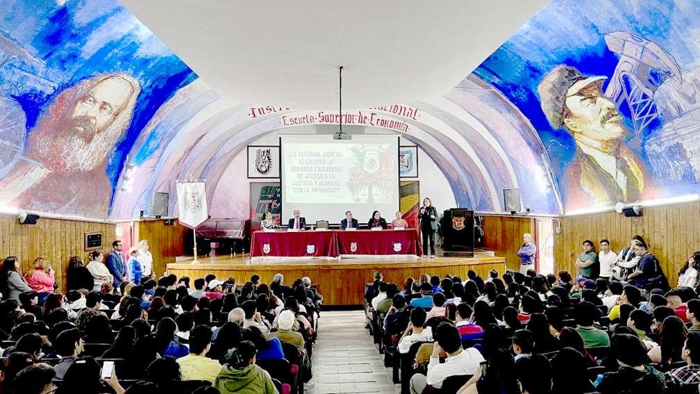 En la conferencia estuvieron presentes Marco Antonio López Luna, subdirector de Servicios Educativos e Integración Social; Maribel Cruz García, jefa del departamento de Control Escolar;así como estudiantes y egresados de la Escuela Superior de Economía.