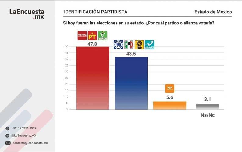 Pero,a la pregunta de ¿cuál partido político considera que ganará la elección? la coalición que encabeza Alejandra Del Moral ganaría con el 49.1 por ciento, mientras que la que respalda a Delfina Gómez quedaría en 42.1 por ciento.