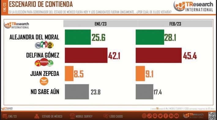 El estudio indica que en febrero,la maestra Delfina Gómez tiene el 45.4 por ciento de intención de voto,por 28.1 por ciento de Alejandra del Moral,una diferencia de 17.3 puntos, demostrando que la aspirante del PRIAN no levanta en las encuestas. Delfina Gómez domina el rubro de los atributos con doble dígito de distancia.El 47.6 de los encuestados reconocen en la maestra a una mujer honesta;el 42.5 cree en su capacidad para gobernar y el 41.6 confía en ella para gobernar mejor.