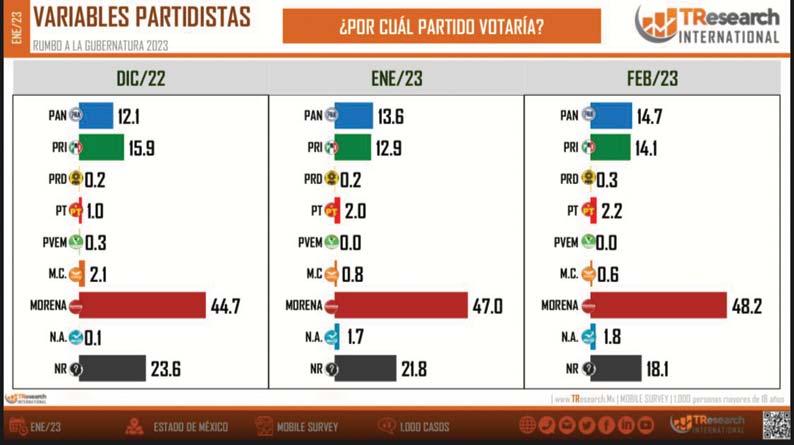 Reforzando el dato anterior,el 48.2 de las y los encuestados señaló que votaría por MORENA, mientras que apenas el 14.7 lo haría por el PAN, y 14.1 por el PRI.