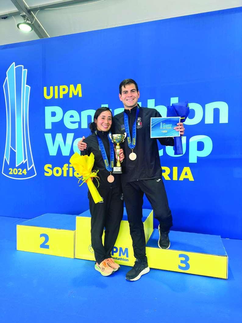 Los seleccionados nacionales de pentatlón moderno, Catherine Oliver Lara y Duilio Carrillo González, cosecharon la medalla de bronce, con un total de 1,350 unidades en la final de relevos mixtos,pruebaquecerrólasactividades de la cuarta y última Copa del Mundo 2024, que se realizó enSofía,Bulgaria. En su camino al podio,los mexicanos sumaron 246 puntos en esgrima, 293 en equitación, 293 en natación y 518 en la prueba combinadadetiro-carrera;elprimer lugar fue para la dupla de Egipto con 1,352 unidades y la plata correspondió a China con una suma de1,351 puntos. Esta es la tercera ocasión en que México sube al podio en la pruebaderelevosmixtosenloqueva del serial de Copas del Mundo 2024,luego de la medalla de oro ganadaporlasduplasintegradas por Mariana Arceo y Carrillo en la primera fecha en El Cairo, Egipto a principios de marzo,así comoporMayanOliveryManuel Padilla en la tercera parada que se desarrolló en Budapest, Hungría. En los próximos días, la Federación Internacional de Pentatlón Moderno dará a conocerlaslistasoficialesdelosclasificados a la Final de Copas del Mundoenambasramas,estáprogramadadel22al26demayo,en Ankara,Turquíayotorgaráplazas directas a los Juegos Olímpicos a lostresprimeroslugaresdecada rama.