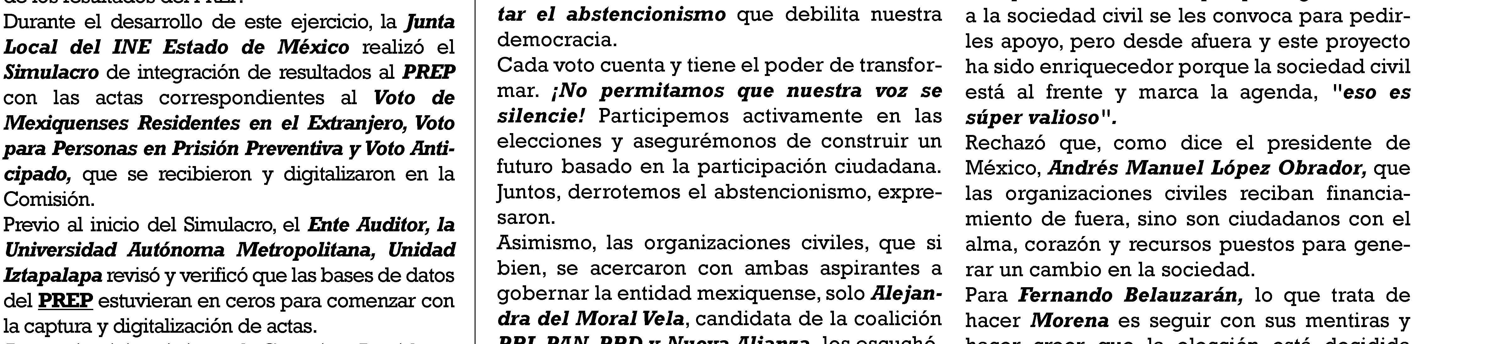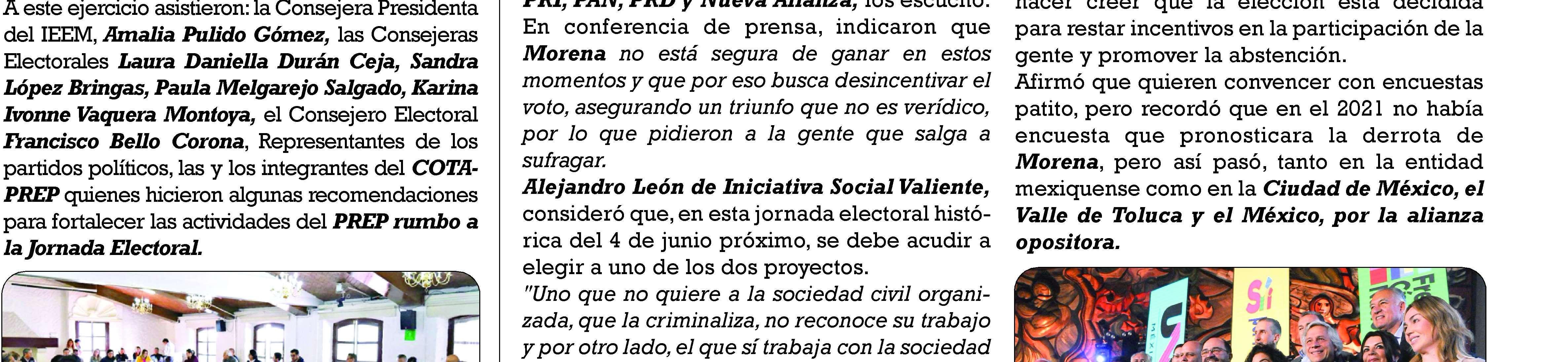 Altoamensajes mensajesde de odio odiocontralaSCJN rculacióncertificadaporROMAYHERMIDAYCIA.S.C.FOLIO00151-RHYPrecioejemplar$6.00.Dólar:19.28,alaventa;18.78,alacompra.Toluca:23Máx.,1Mín. MR PresidenteEditorDr.NaimLibienKaui Martes30demayode2023AñoXXXIVNo.12713 RaúlRuiz-TanyaAcosta-RafaelOrtiz-RobertoMeléndez11 Redacción9 Másdecuatromil cuatromilmexiquenses pudieronejercervotoanticipado yenprisiónpreventiva ¡Todosytodasavotar Todosytodasavotar! evitarabstencionismo evitarabstencionismo